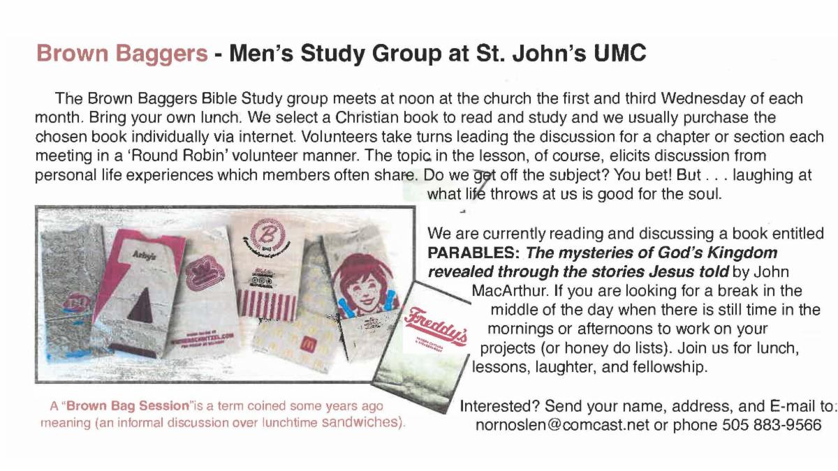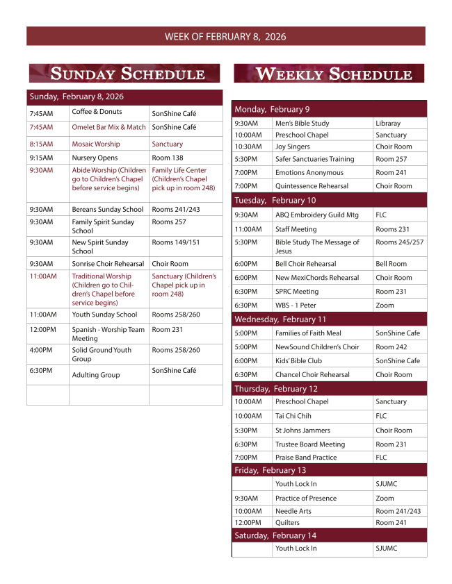 Memory Café meets the first Saturday of each month at 1:30pm - 3:00pm in the Sonshine Cafe. It is a supportive fellowship for anyone affected by memory loss/Alzheimer’s and their caring partners. Meet and share with others on a similar journey. This is not a drop-off event. For more information (505) 323-7522 or ssmjens@aol.com. You don’t need to register and there is no cost for the event. Join us for a fun time designed for you!