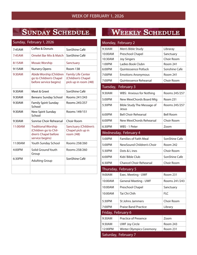 Memory Café meets the first Saturday of each month at 1:30pm - 3:00pm in the Sonshine Cafe. It is a supportive fellowship for anyone affected by memory loss/Alzheimer’s and their caring partners. Meet and share with others on a similar journey. This is not a drop-off event. For more information (505) 323-7522 or ssmjens@aol.com. You don’t need to register and there is no cost for the event. Join us for a fun time designed for you!