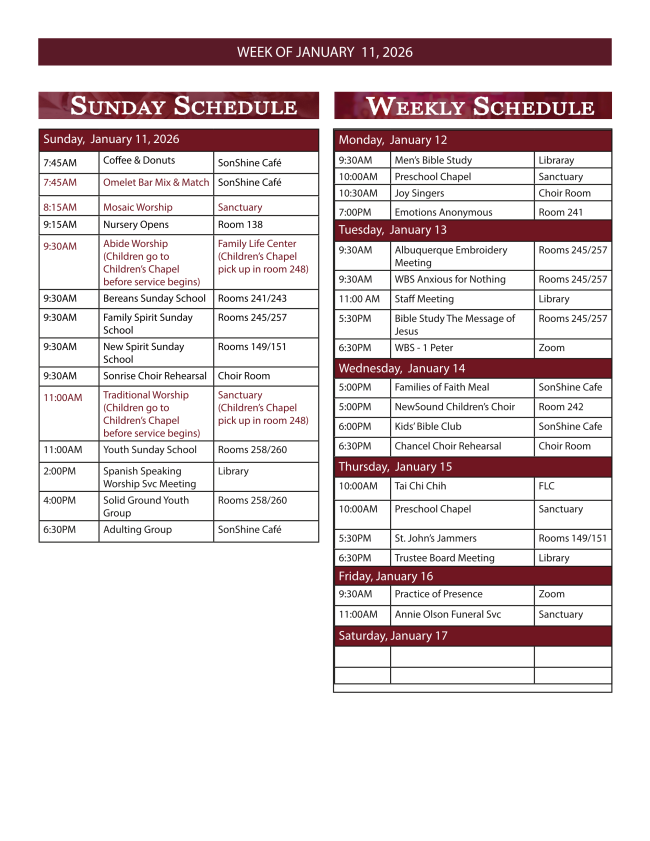 Everyone has or will experience the grief that comes when we lose a spouse, a beloved loved family member, a dear friend or a precious pet. Grieving is felt differently by different people and may be expressed through different emotions such as anger, sadness, and depression. Loneliness also often accompanies grieving. Some people find support in their grieving though meeting with others in a caring, compassionate, and safe space where feelings can be explored, and support may be found through talking with others. We offer an invitation to those who are newly experiencing grief and for those who have suffered significant loss over time. Grief has no definitive ending. Please join us on Thursday, January 15 from 1:30 to 3:00 in the Church Library, 2nd floor. Park in the West parking lot and ring the bell for entrance. Contact Carol Dolan or Karen Hall at care@stjohns-abq.org for additional details.