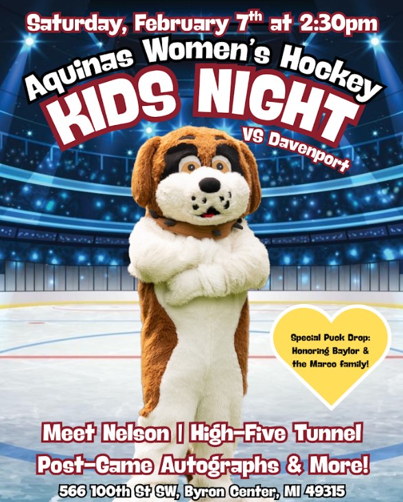 Aquinas Women’s Hockey hopes you had an amazing holiday season! We are so excited to invite you to our Kids Night on Friday, February 7th at 2:30 PM at Southside Ice Arena in Byron Center, where we will take on the Davenport University Panthers in an action-packed, family-friendly hockey game!
