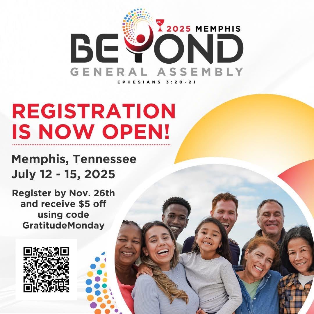 The General Assembly of the Christian Church (Disciples of Christ) will gather in person from July 12-15, 2025, in Nashville, TN. The theme: "Beyond" based on Ephesians 3:20-21. Registration is open!