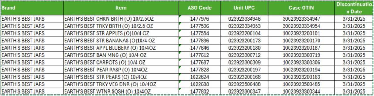 The following Jarred baby food products will remain available until the designated run-out date or while supplies last: