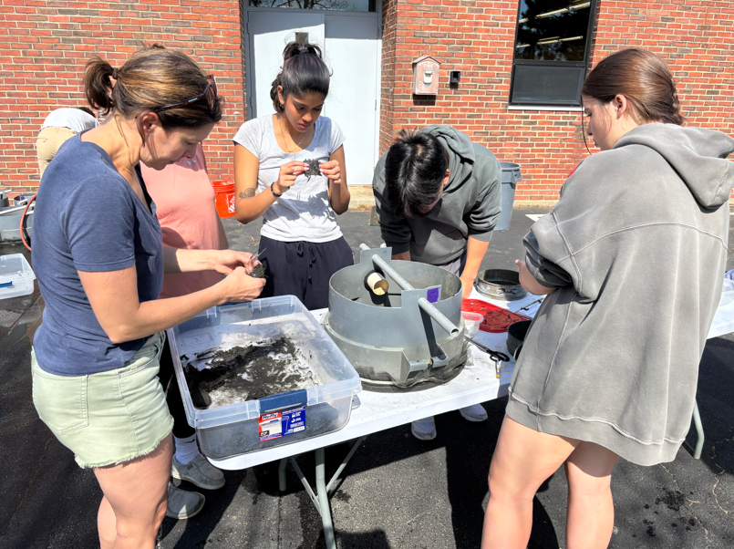 This is the question Deirdre Healey, Director of the Office of Community Service & Partnerships at the Leduc Center posed to Art & Design Professor Stacy Latt Savage. To take on this challenge, the sculpture program paired with Assistant Director of Campus Sustainability Jamie Jacquart to bring visiting Artist-in-Residence Rebecca McGee Tuck, a Boston-based activist artist, to lead this endeavor on campus: making trash into a sculpture that brings a visceral awareness to the global environment crisis. This has been a “super collaboration” across the UMass Dartmouth campus and evolved into Sculpture Monster: A creature from the Plasticine Era.