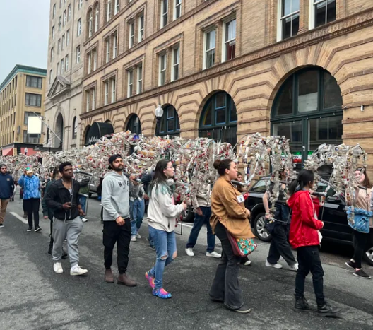 The Creature slithers its way through the streets of New Bedford, MA, during AHA Earth Eve Event on April 11, 2024