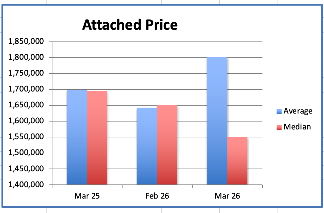 Attached homes average $1.802M, down 4.4% from the 2024 peak.