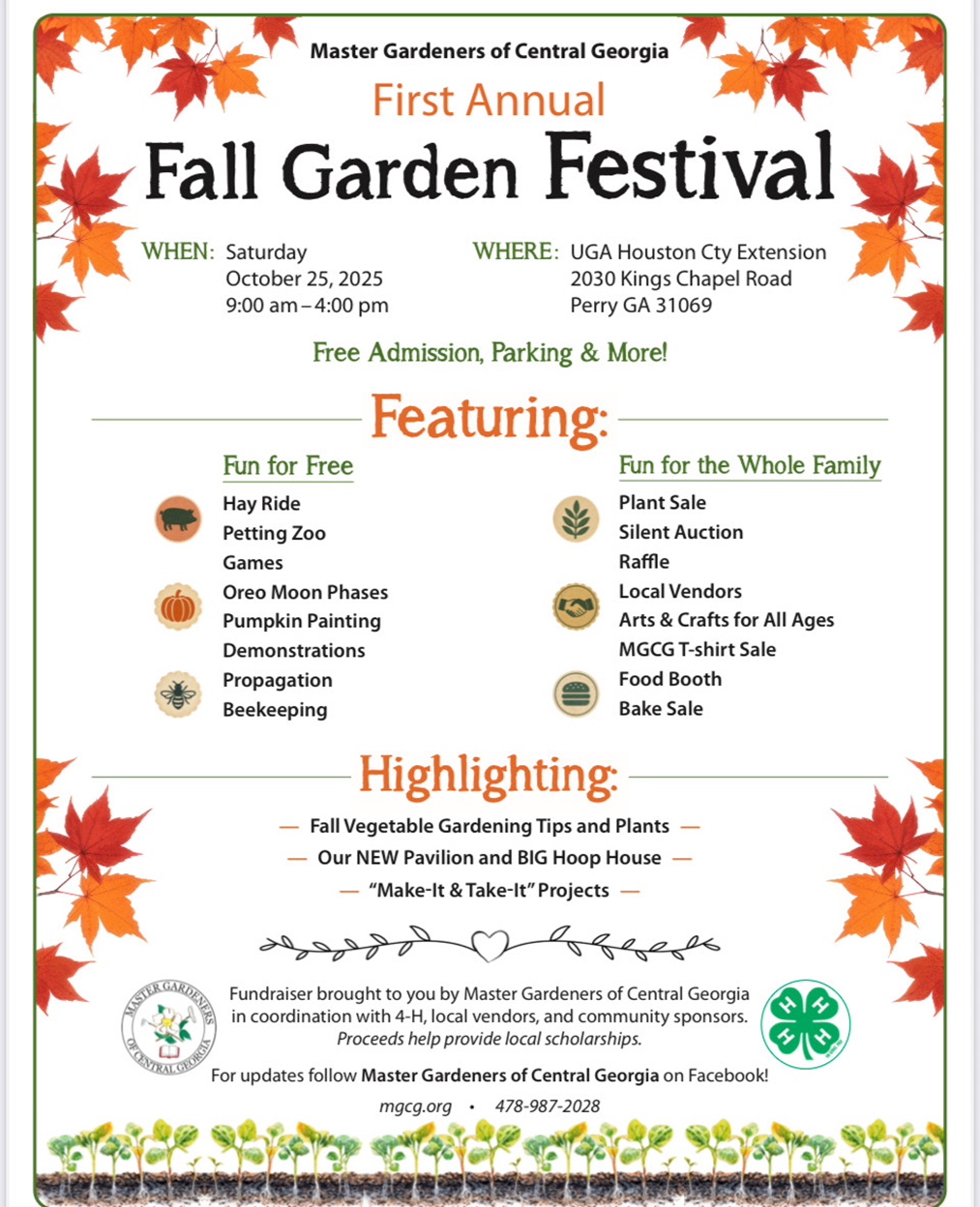 The Master Gardeners of Central Georgia will host their First Annual Fall Garden Festival on Saturday, October 25, from 9:00 a.m. to 4:00 p.m. at the UGA Houston County Extension (2030 Kings Chapel Road)!