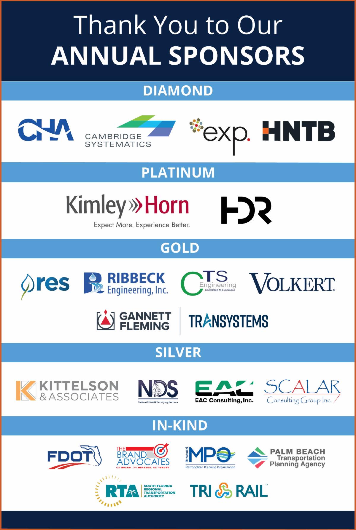 The WTS South Florida Chapter could not have achieved our mission without the support of our sponsors. To become a sponsor today, please contact the South Florida WTS Sponsorship Committee representative Mayren Franco at mfranco@HNTB.com.