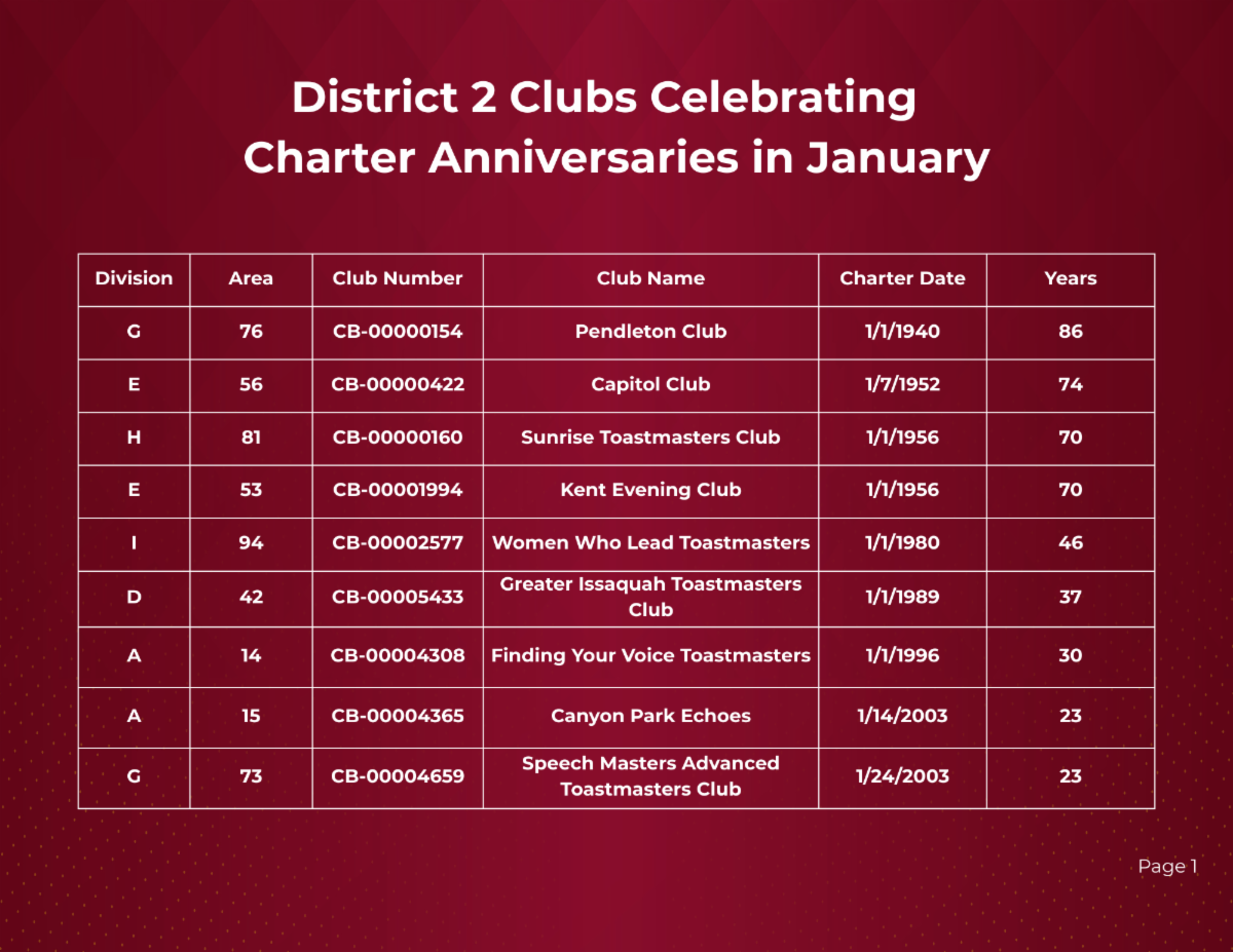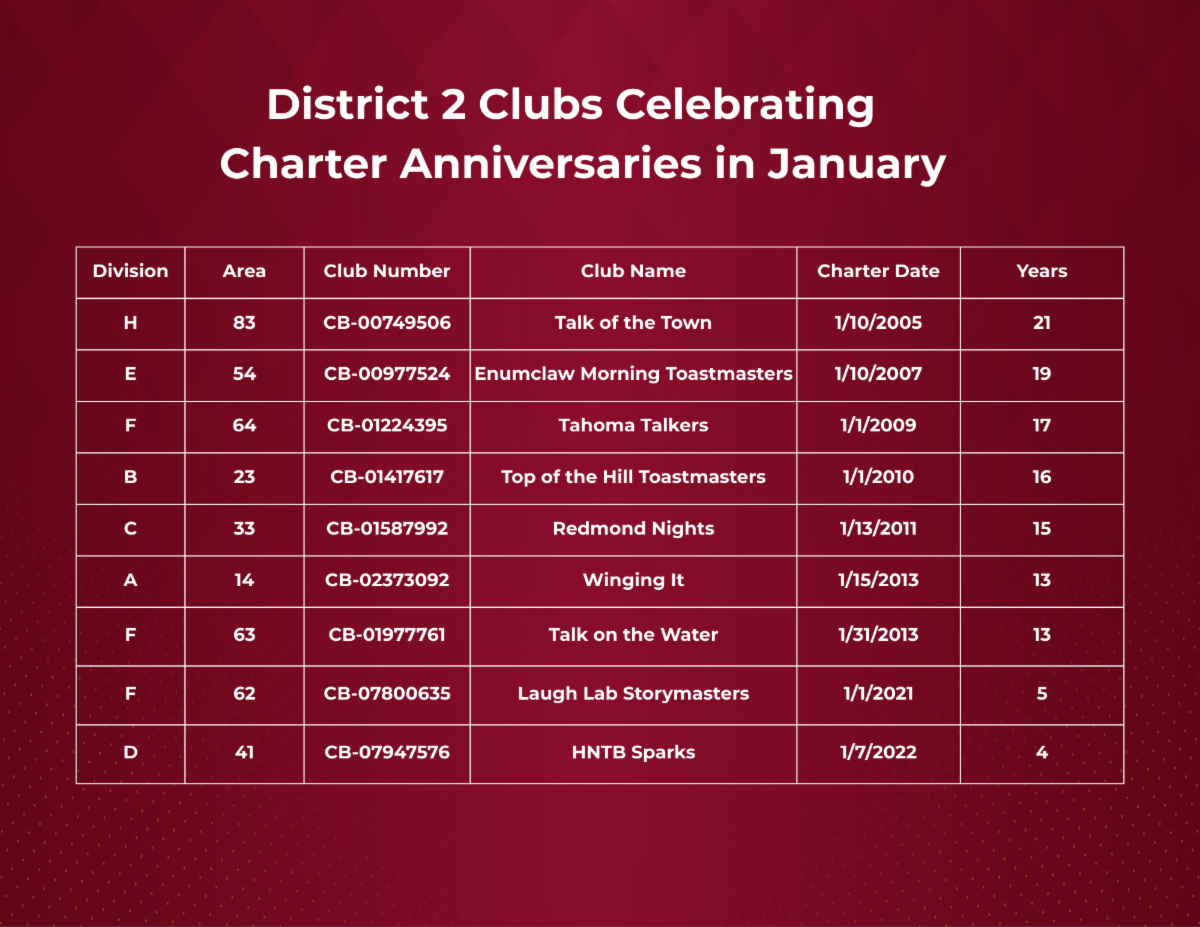 District 2 celebrates the dedication of every past and current member who has helped develop a supportive environment for growth. May you have many more years of transforming lives, one speech at a time!