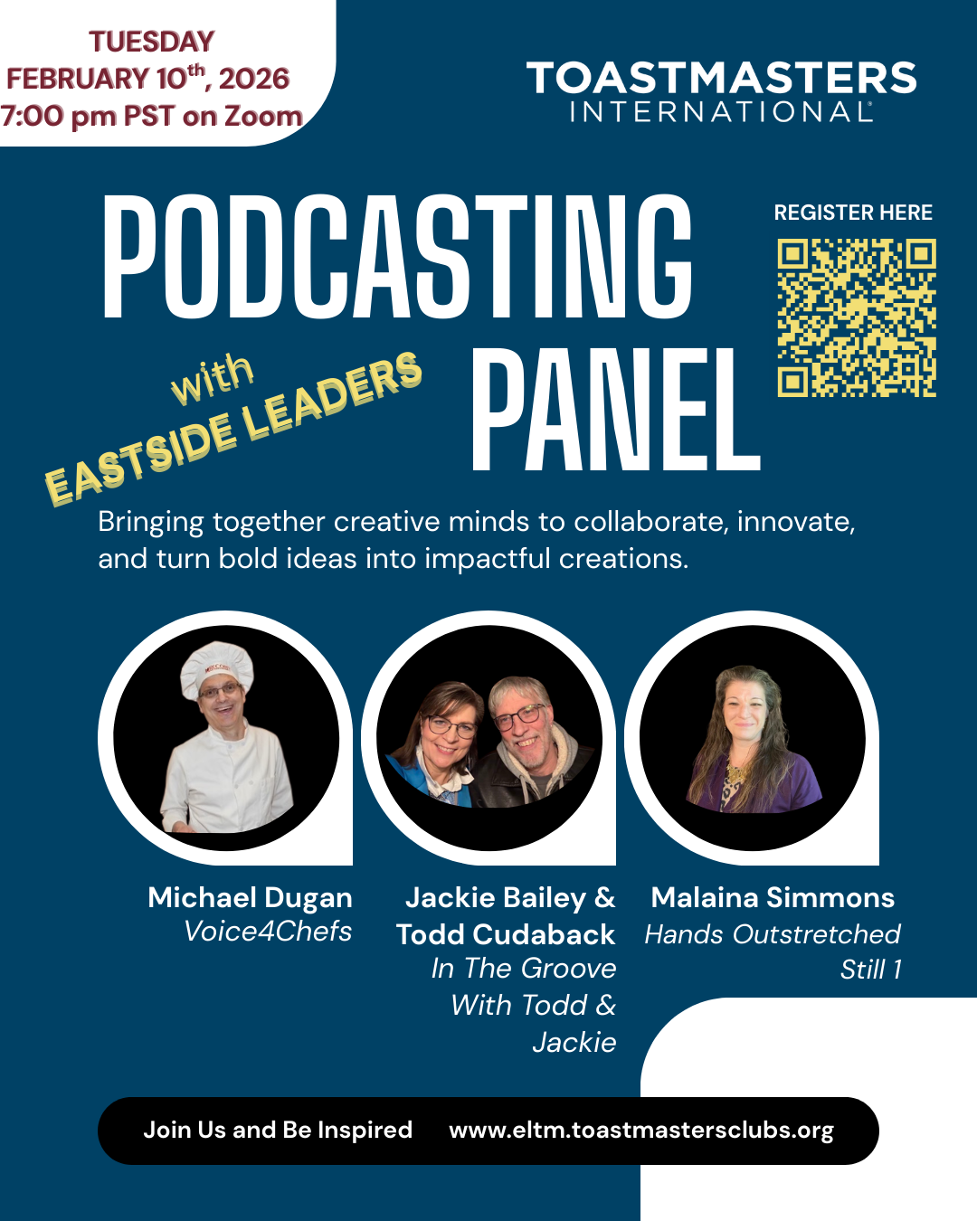 On Feb. 10 you can find out. Michael Dugan of “Voice for Chefs;”; Todd Cudaback and Jackie Bailey of “In the Groove With Todd and Jackie”; and Malaina Palmer Simmons of “His Arm Is Outstretched Still” will give us the scoop. As participants in a panel discussion, they will tell us about starting and running successful podcasts. The topics of their podcasts are diverse, but they are passionate about their interests. Their experience levels range from recently going solo to very experienced.
