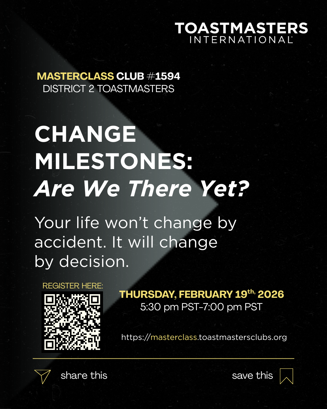 Masterclass Toastmasters is an advanced club focused on leadership development. Monthly meetings--with a change management theme--help members and guests explore varied dimensions of change! All to help our guests and members better serve as leaders in their organizations.