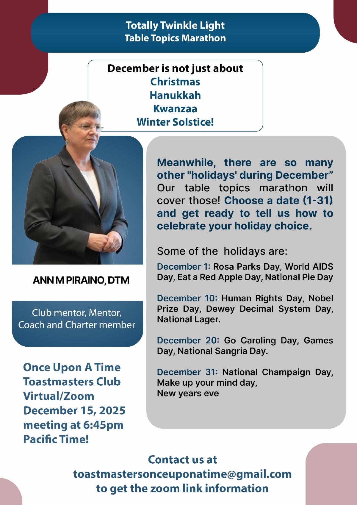 These sessions are the perfect opportunity to ask questions, gain valuable insights, and enhance your Toastmasters experience, whether you’re new to Pathways or seeking targeted advice. We will also present a project from the Education Series that are a part of the new Pathways Enhancements requirements.