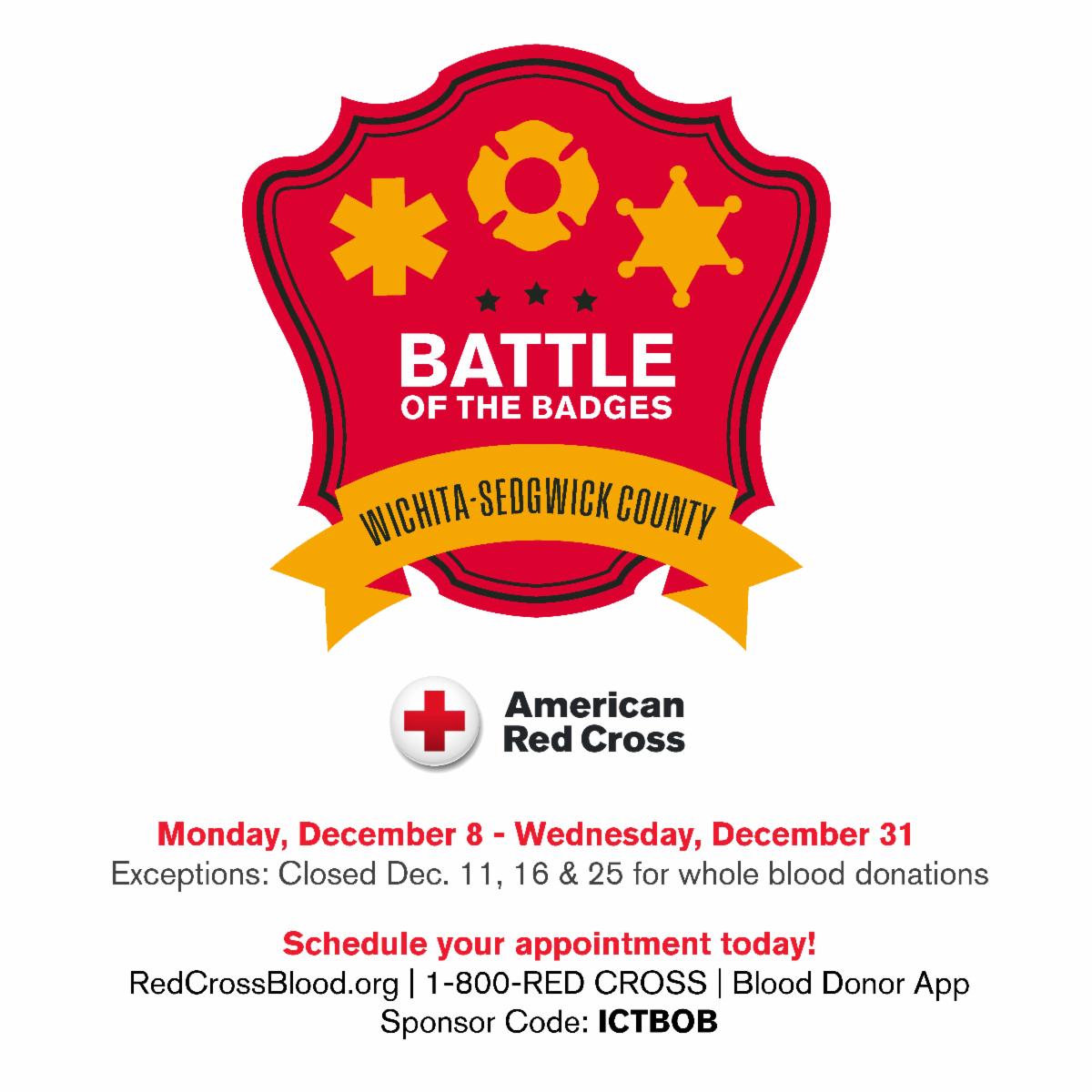 | | Bryan Ellis earns Lifetime Hero award | | Recently the Wichita chapter of the American Red Cross held its Tribute to Heroes Breakfast, recognizing "ordinary people who do extraordinary things." Among the five honorees, Bryan Ellis - Operations Manager for Sedgwick County Emergency Management - earned the Lifetime Hero award for donating 11,800 hours of service to the Red Cross. Congratulations on this well-deserved honor! | | Donate and Vote in Battle of the Badges | | Time is running out for you to take part in the Battle of the Badges! Wednesday, Dec. 31, is the last day you can donate blood in this friendly competition and vote for your favorite first responders. Local law enforcement, firefighters and EMS are competing to take home the trophy. Schedule an appointment now at www.redcrossblood.org and help save lives! | | Take an inside look at EMS ambulances | You’ve seen these vehicles on the street, but now we’re giving you a look inside! Watch this video to learn how Sedgwick County EMS ambulances are equipped to help you when seconds count! | | First responders deliver Holiday Food Boxes | | For the 36th year, Sedgwick County first responders helped about 400 families in need by delivering two holiday food boxes to each home from Dec. 10-12. To cover the cost, the Sheriff's Office Benefit Fund raised nearly $36,000 in donations, including a $5,000 contribution from the Beach Family Foundation. Dillons Food Stores also provided materials, warehouse space and personnel to support the effort. It truly IS the season of giving! | |