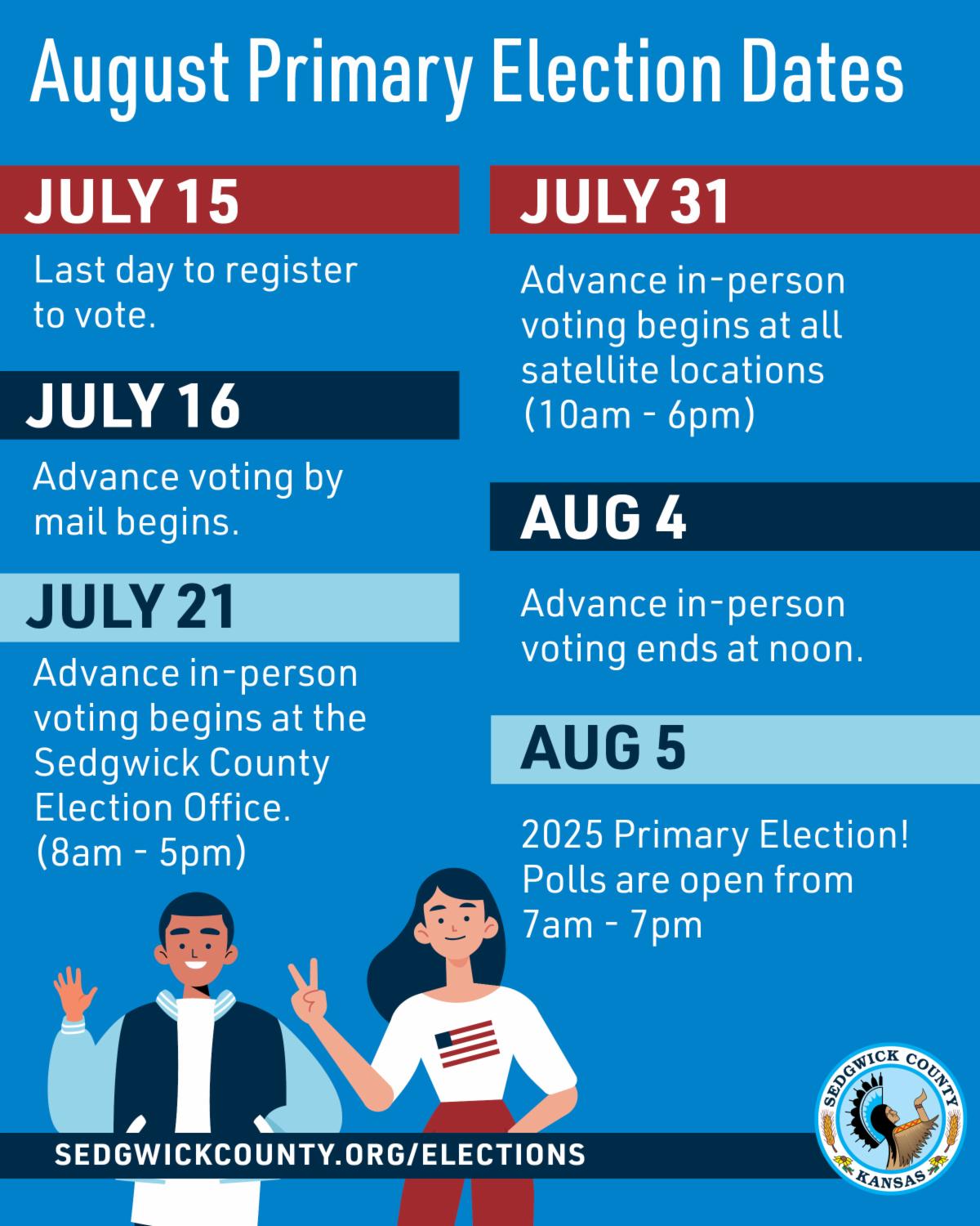Make your voice heard and cast a ballot in the Aug. 5 primary election! The deadline to register to vote is Tuesday, July 15, 2025. If you're already registered but have moved or changed your name, you need to update your information on file. Visit Registration | Sedgwick County, Kansas.