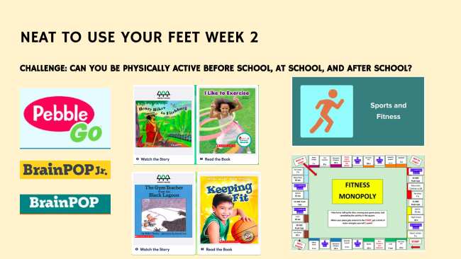 This week's focus is physical activity. Students are challenged to use their feet (walking, playing sports, jogging, etc.) every day before, during, and after school!