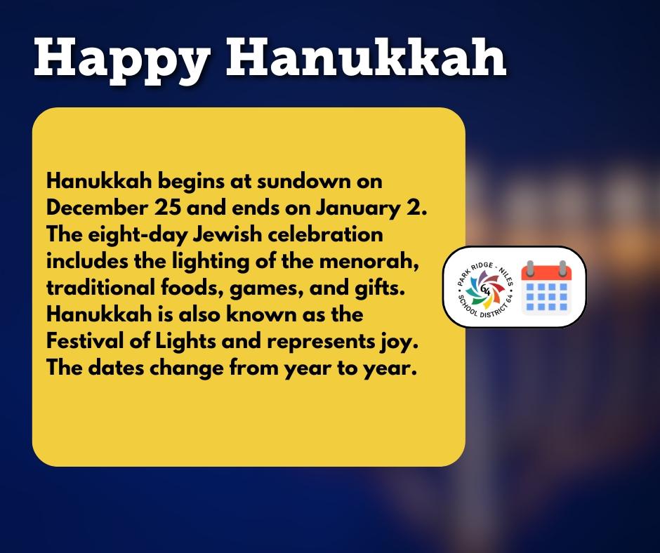 Hanukkah begins at sundown on December 25 and ends on January 2. The eight-day Jewish celebration includes the lighting of the menorah, traditional foods, games, and gifts. Hanukkah is also known as the Festival of Lights and represents joy. The dates change from year to year. | |