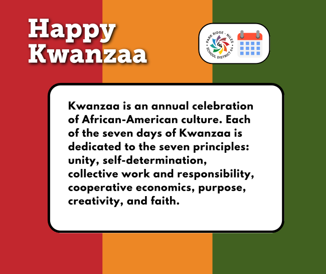 Kwanzaa is an annual celebration of African-American culture. Each of the seven days of Kwanzaa is dedicated to the seven principles: unity, self-determination, collective work and responsibility, cooperative economics, purpose, creativity, and faith. Kwanzaa starts on December 26. | |