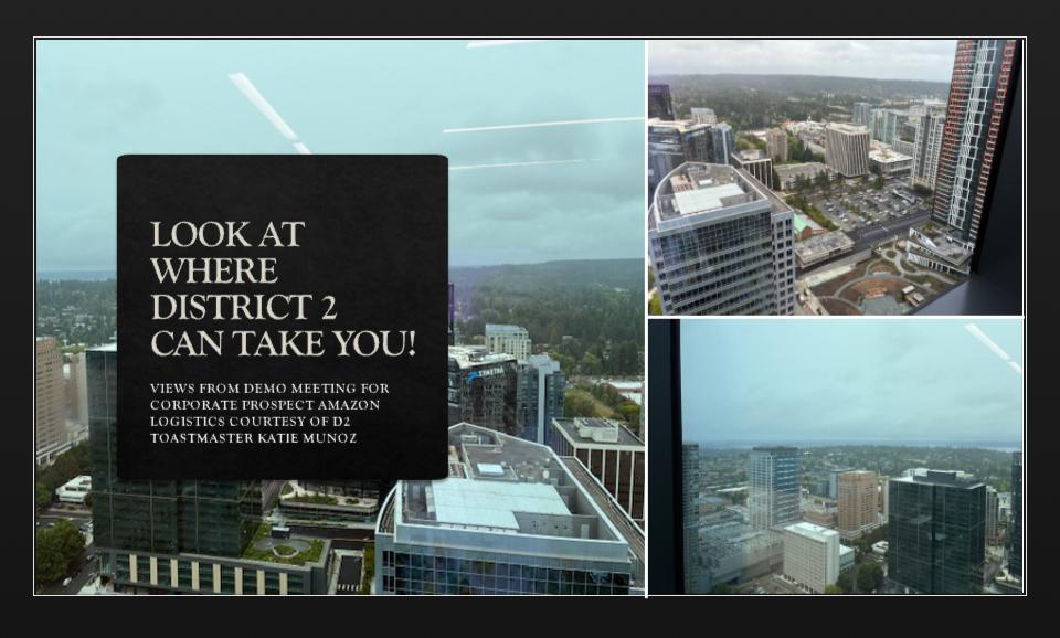 I have recently been contacted by District 2 Toastmasters with ideas to build community, keep us informed, and provide opportunities to stretch ourselves. It's truly exciting to see our District pulse with great ideas. Do you have a curiosity or creative contribution that you want to make? Please reach out to Marty Varela, PRM and let me know!