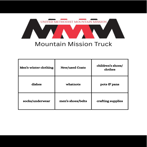 For over 80 years, Methodist Mountain Mission has been serving the people of Eastern Kentucky by collecting gently used clothing, household goods, and more to stock its eight Opportunity Stores across the region. The Mission’s trucks travel throughout several states to gather these donated items, which are then sold at affordable prices to support local families, provide jobs, and fund ministry work. Your contributions — whether items or financial gifts — keep this vital ministry rolling and bring dignity and support to those in need. No gift is too small — every donation helps share God’s love in the mountains! Drop off donations at Concord UMC from Feb. 23-Mar. 1 in their Fellowship Hall. | 2026 Truck Schedule