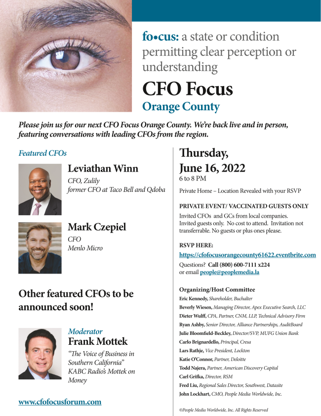 Join us at CFO Focus Orange County on Thursday and find out what else you don’t know about Leviathan. 6-7 reception, 7-8 program with KABC’s Frank Mottek in the anchor chair. Also featured is Mark Czepiel, CFO at Irvine-based Menlo Micro, which just announced its $150 million Series C as it continues to disrupt the electronic switch industry with its US based manufacturing operations.