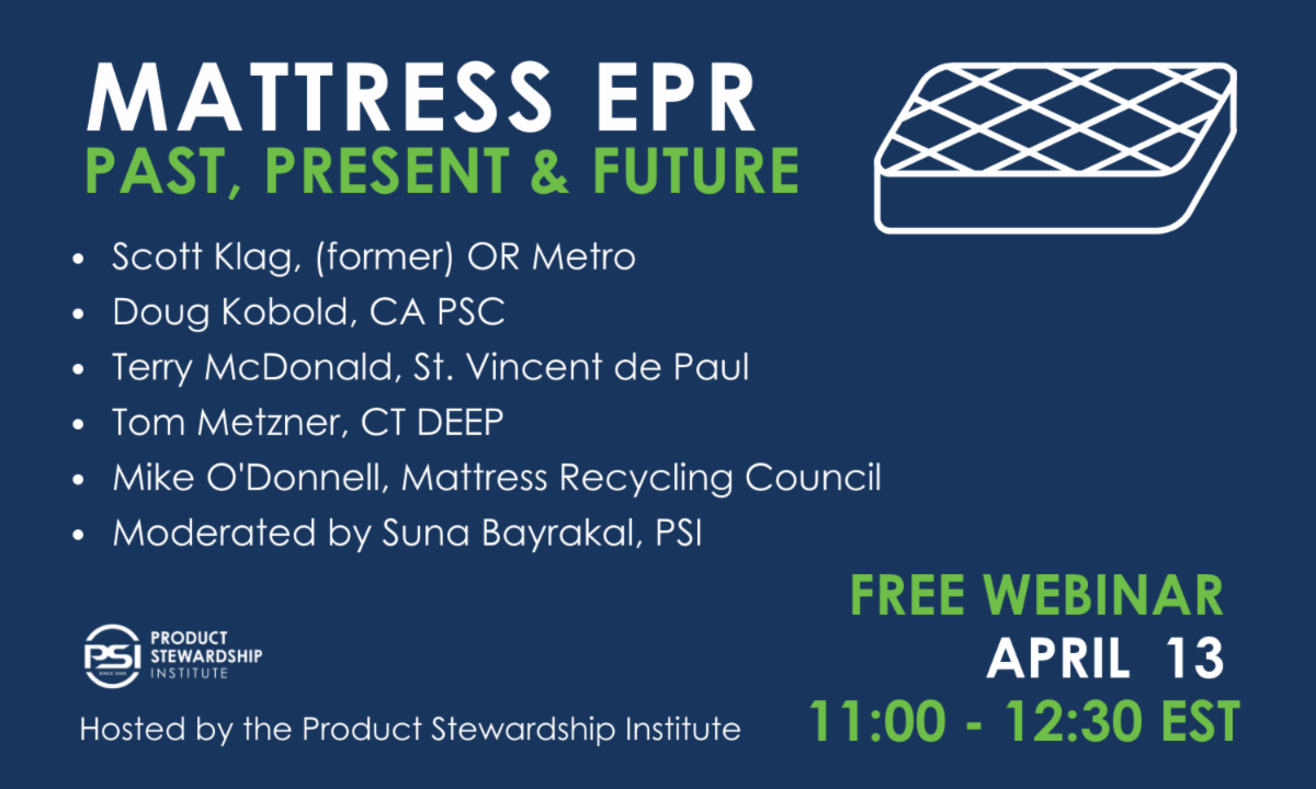 May 11 Kalamazoo, MI - Amanda Nicholson, PSI’s Chief Operating Officer, will present on opportunities and approaches for EPR across multiple product categories at the Michigan Recycling Coalition Annual Conference. Register here.