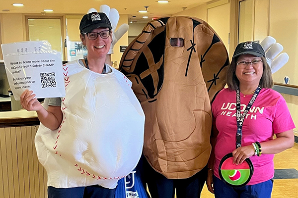 What are a human baseball and mitt doing in our hospital? They're our Safety Champ co-chairs, (from left) Amy Zipf, Christine Campbell, and Arlene Villahermosa-Labarda, who spent part of Nurses Week making the rounds to promote their "Good Catch" patient safety initiative. In the coming weeks they (though likely not in costume) will present their 2022 "Greatest Catch of the Year" award!