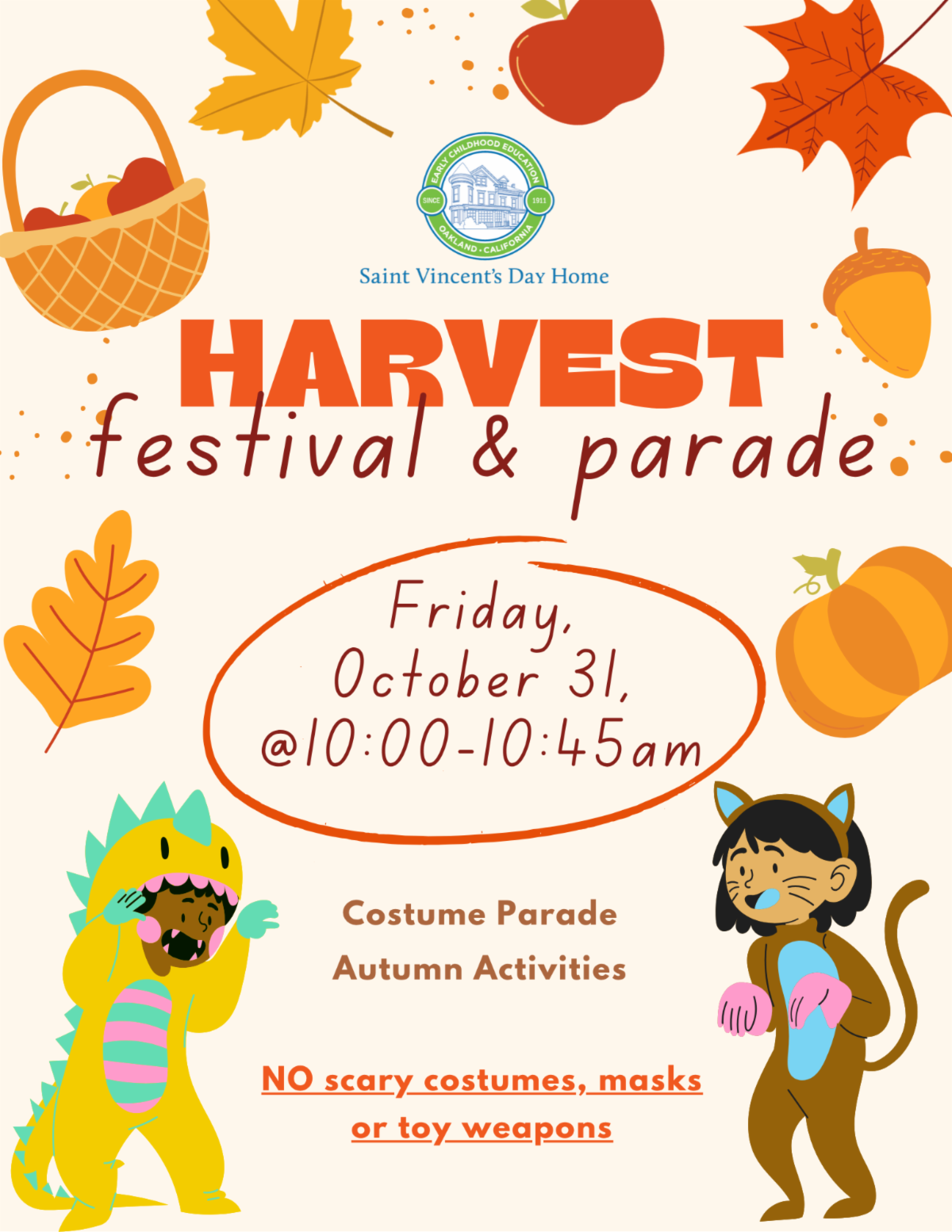 Join us on Friday, October 31st, from 10:00–10:45 AM for our Harvest Festival! Children will parade around in their costumes and collect special treats along the way. After the parade, they’ll enjoy autumn-themed activities to celebrate the season together.