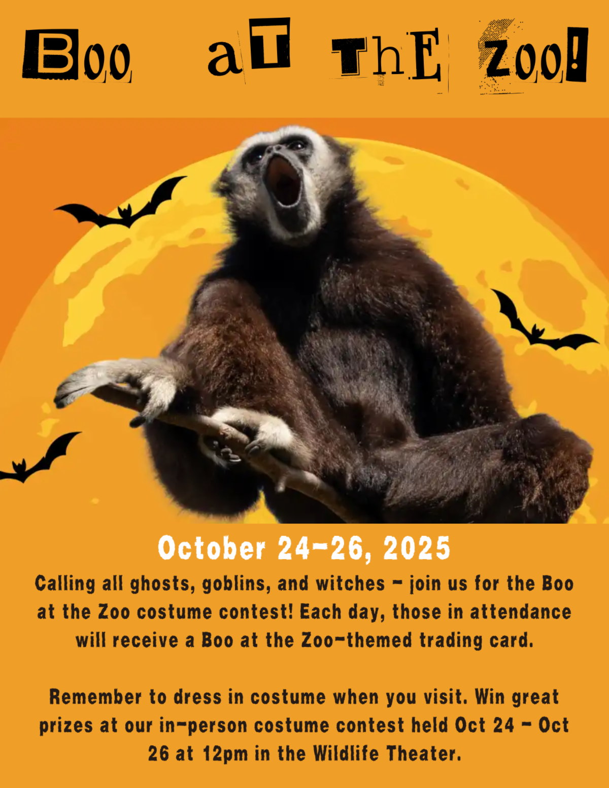 Celebrate Halloween early at Oakland Zoo’s Boo at the Zoo on October 24–26! Kids and families can join the costume contest at noon each day, receive a special edition animal trading card, and enjoy a fun-filled day of spooky activities. Remember to dress in costume (no inflatable costumes, please) and prepare for a fun-filled day of spooky activities!
