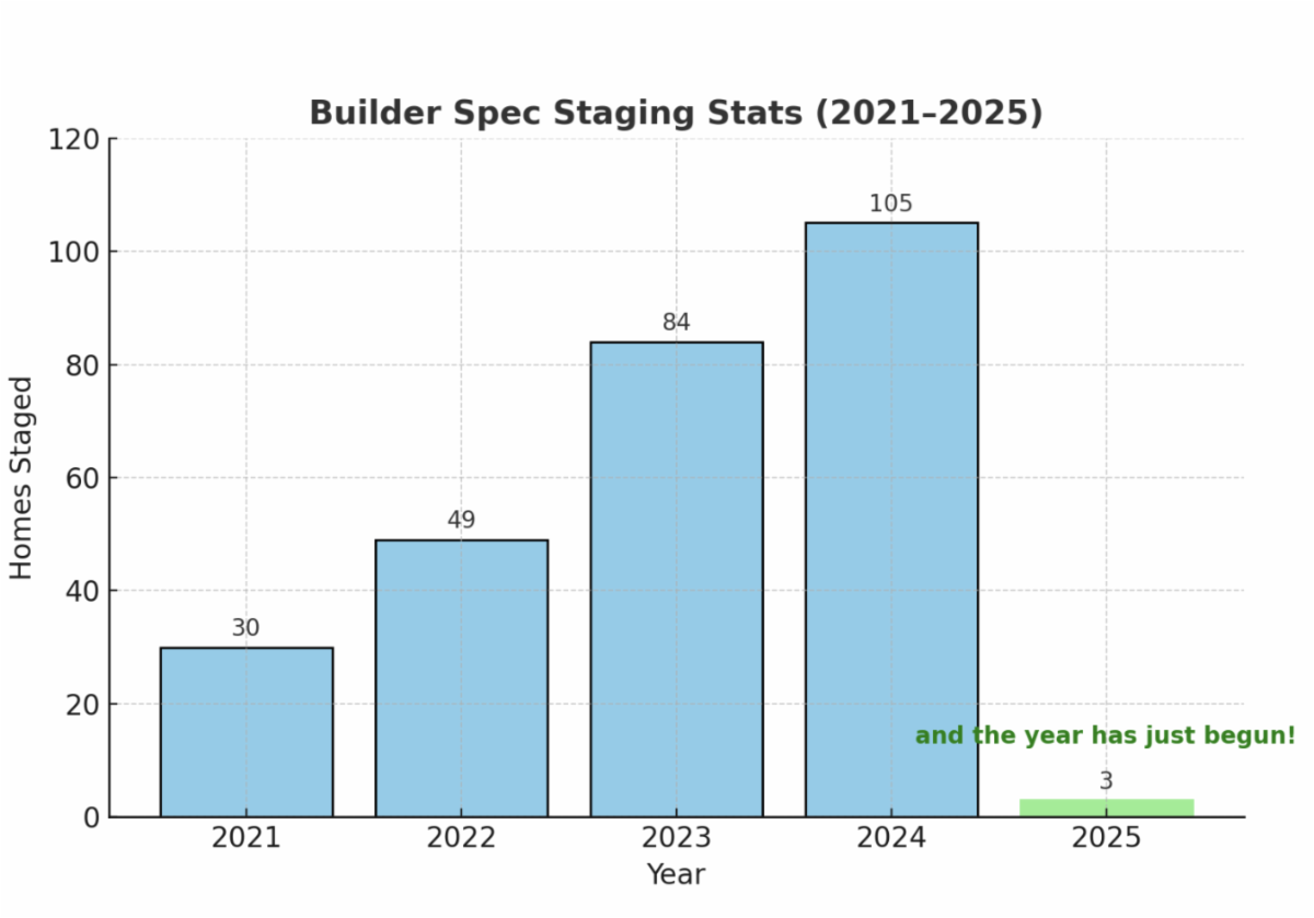 These numbers represent more than just homes staged—they symbolize the growing partnerships we've built with builders and the increasing demand for professionally staged properties. Each home we stage is an opportunity to showcase the builder's craftsmanship, highlight the property's best features, and help potential buyers envision themselves living there. Our dramatic growth, particularly from 2021-2024, reflects the value builders see in our services. From 30 homes in 2021 to over 100 homes in 2024, this upward trend underscores how staging become an integral part of the home-selling strategy for many of our clients.