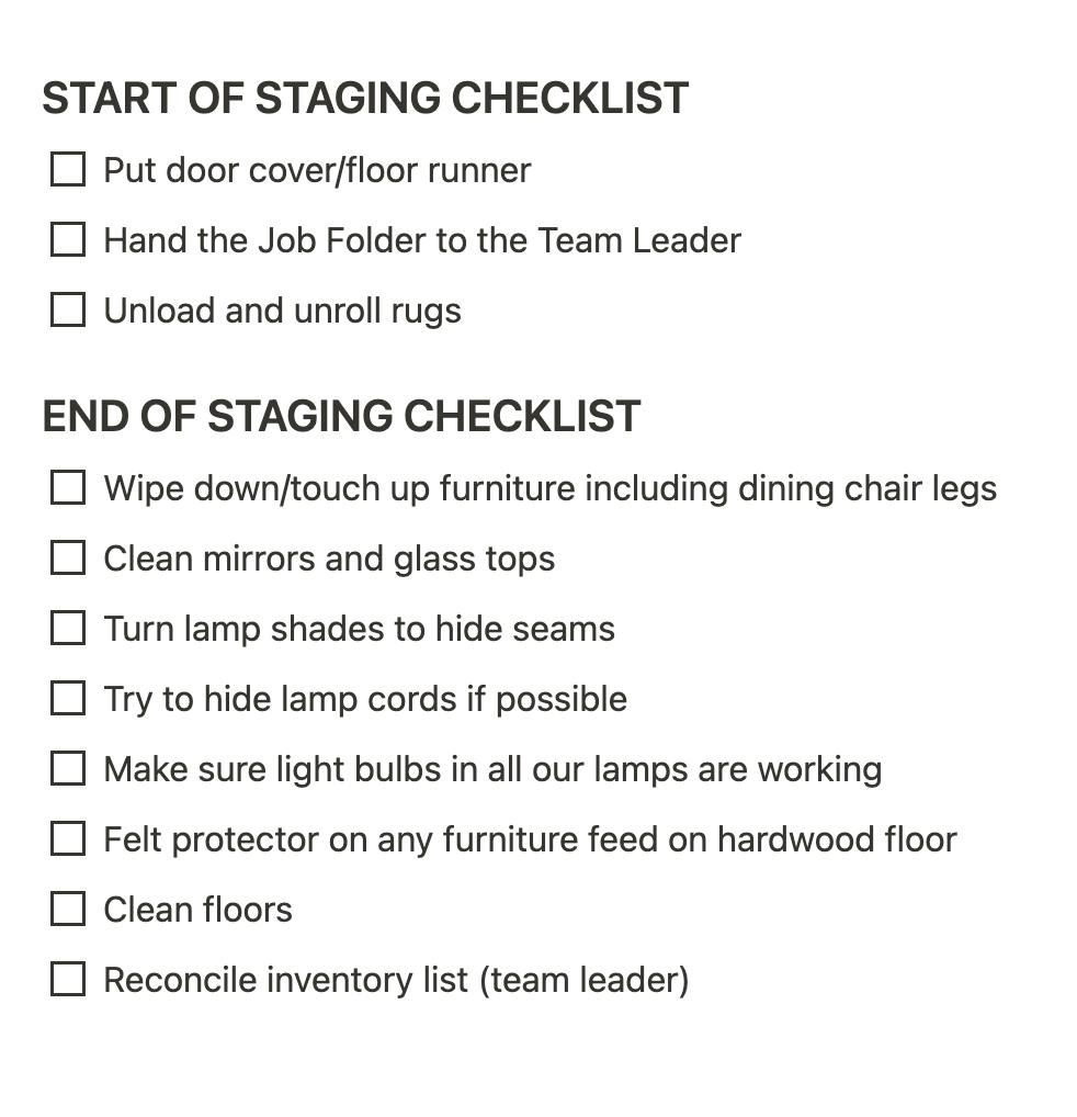 Our checklist is the foundation of our staging process, ensuring that no step is missed and every home looks its absolute best. Here's a sneak peek of our staging checklist: