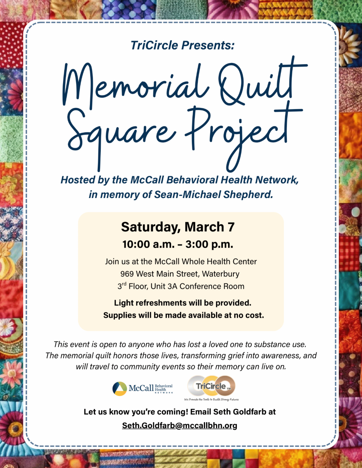 TriCircle Memorial Quilt Square Project - Saturday, March 7, 10:00 am-3:00 pm, McCall Whole Health Center, 969 West Main Street, Waterbury, 3rd Floor, Unit 3A Conference Room, hosted by McCall Behavioral Health Network