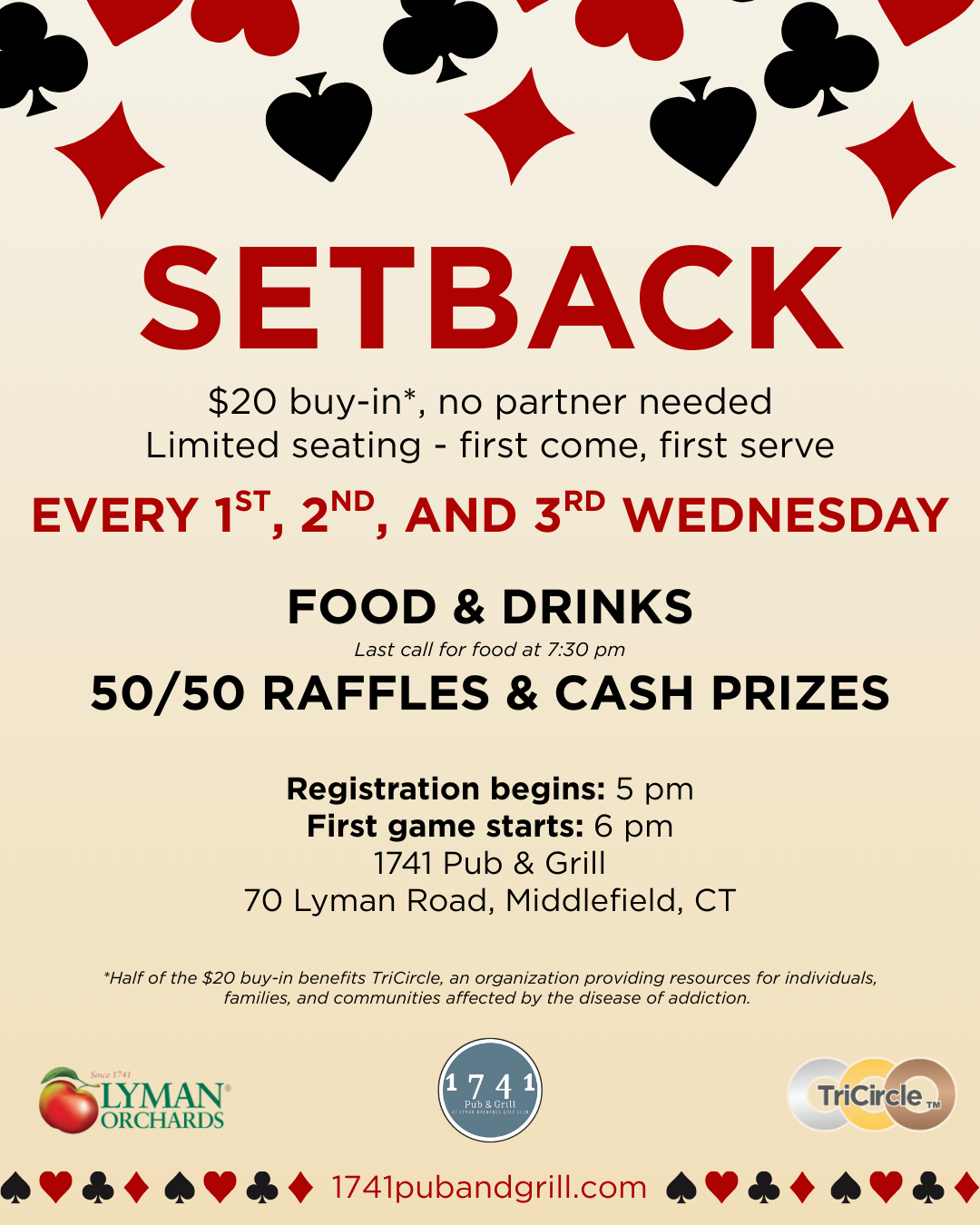 Drop In Setback Middlefield at 1741 Pub & Grill - First, Second and Third Wednesday of each month, February 4, 11, 18 at 72 Lyman Road, Middlefield. Registration opens at 5:00 pm, first game 6:00 pm. (click here)