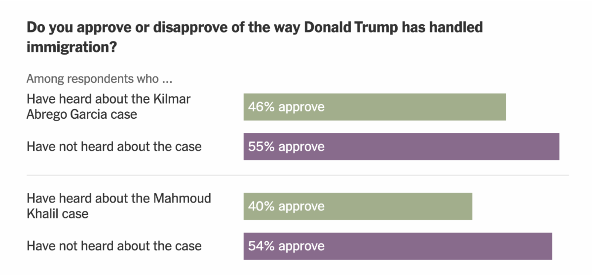 This is wrong on so many levels. Most importantly, the ethical: when someone has been denied due process and incarcerated–let alone disappeared to another country’s prison–we talk about it because it’s the right thing to do. But it also turns out that hearing about these cases is persuasive to voters precisely because what is happening to real people and their families is so wrong. Consider the New York Times/Sienna College poll results below: