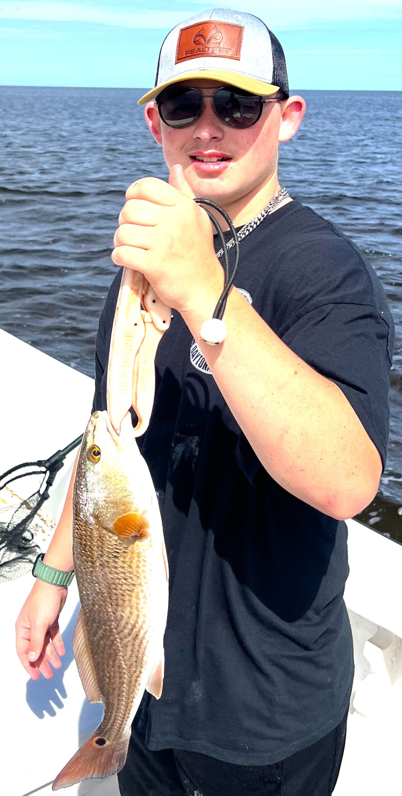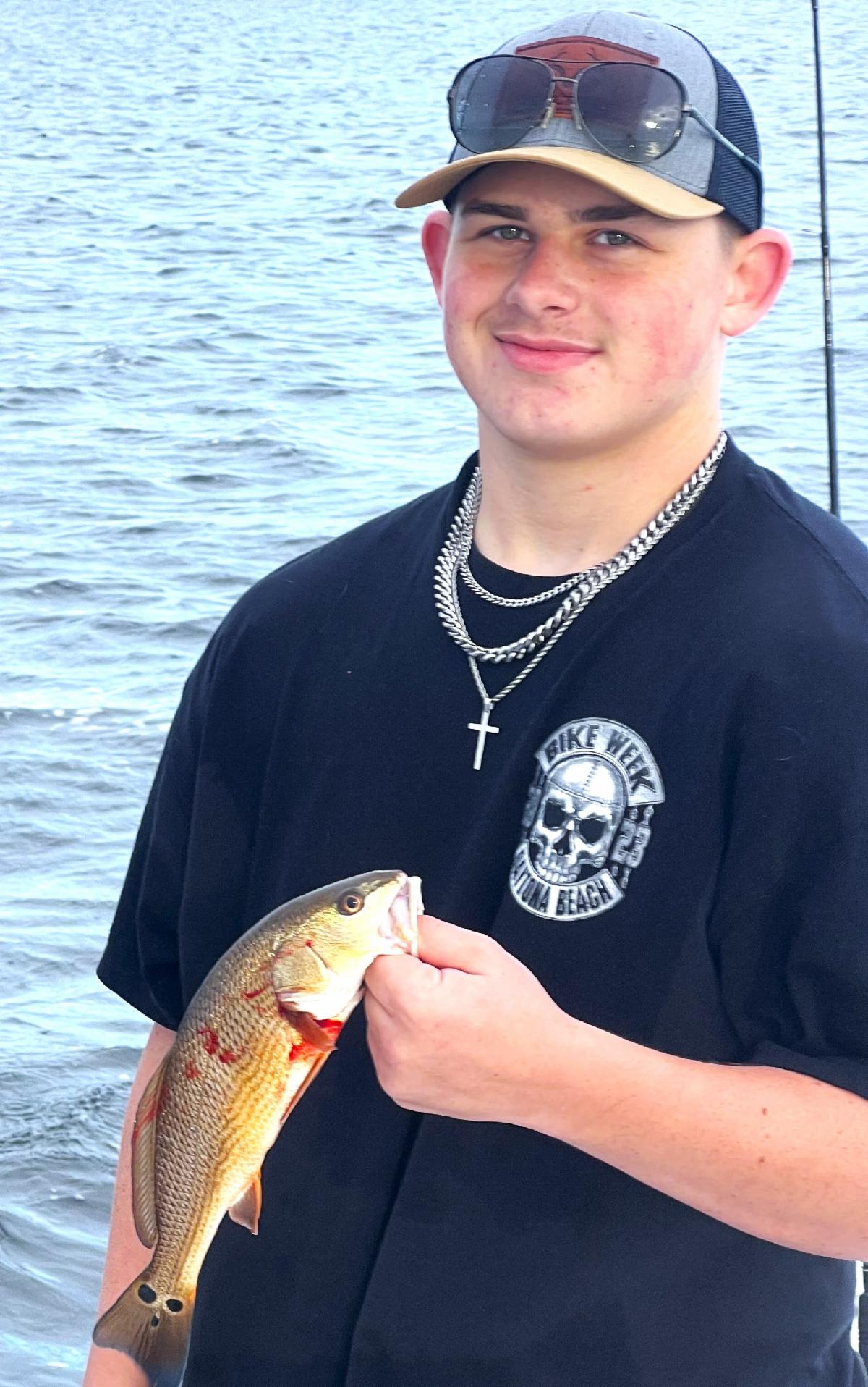 Jake shows off his bigger redfish while he and his friends fish alongside Capt. Chris Chico Graham of OTF Inshore Charters.