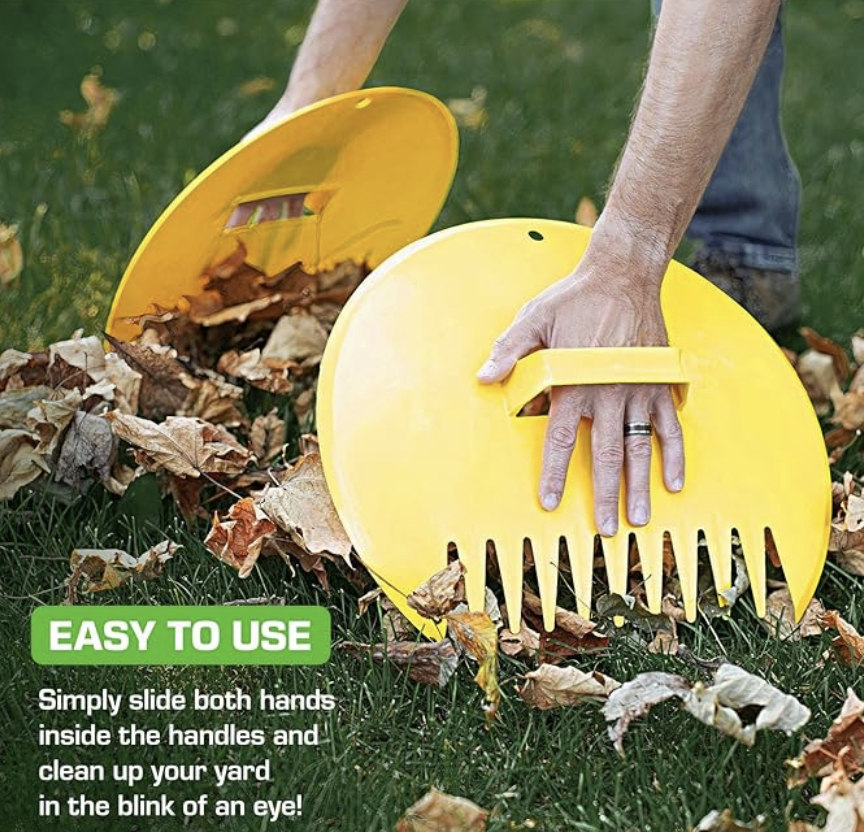 Rugg Leaf Scoops: This set of leaf scoops fit easily onto each hand for easier yard clean up. Scoop up large amounts of leaves and debris while protecting your hands, saving time and effort. Made of high impact plastic. Visit Amazon.com or a hardware store to purchase.