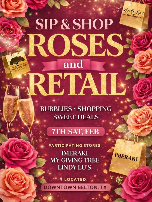 Join us for Roses & Retail, the perfect day to sip, shop, and score sweet deals in Downtown Belton,