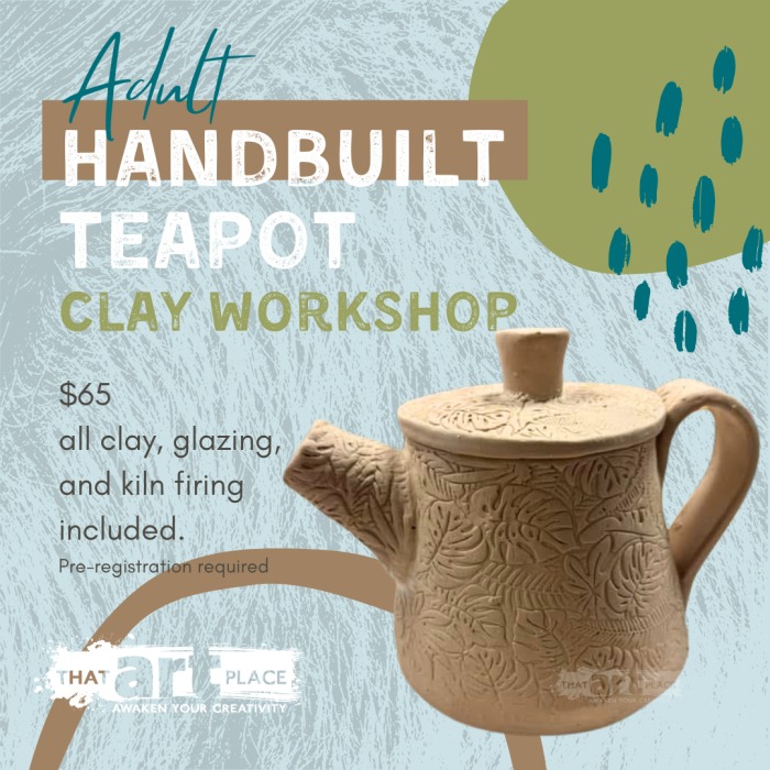 Create your own hand-built teapot in this Clay Workshop at That Art Place! Our instructor will guide you through the process! Your teapot will remain at the studio after the workshop to dry, be bisque-fired, glazed with your choice of glaze, and then kiln-fired a second time. We'll send a text when it's ready to pick up, in about 3 weeks.