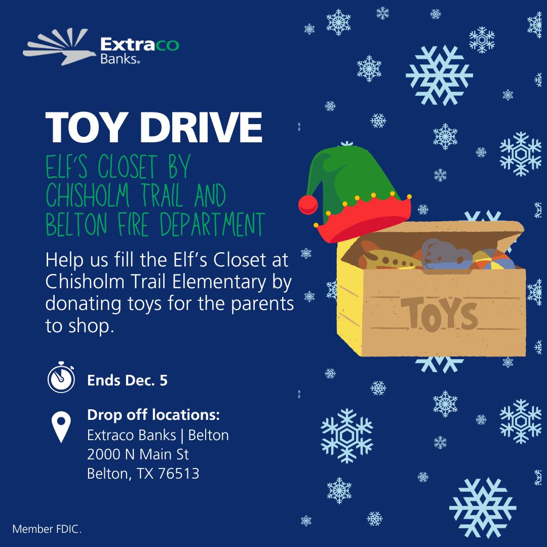 Toy Drive now through Dec. 7th. We are collecting new, unwrapped toys for children ages 5–10. All donations will be distributed, through Elf Closet, to the children of Belton.