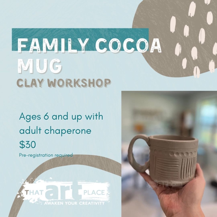 Join us for a fun and creative Family Cocoa Mug Clay Workshop! Each person will create their own mug—perfect for ages 6 and up! After the class, your mugs will remain at our studio to dry and be kiln-fired. They’ll be ready for pickup in about 2-3 weeks. Each person must reserve a seat and will create their own mug. $30 per person. Pre-registration required!