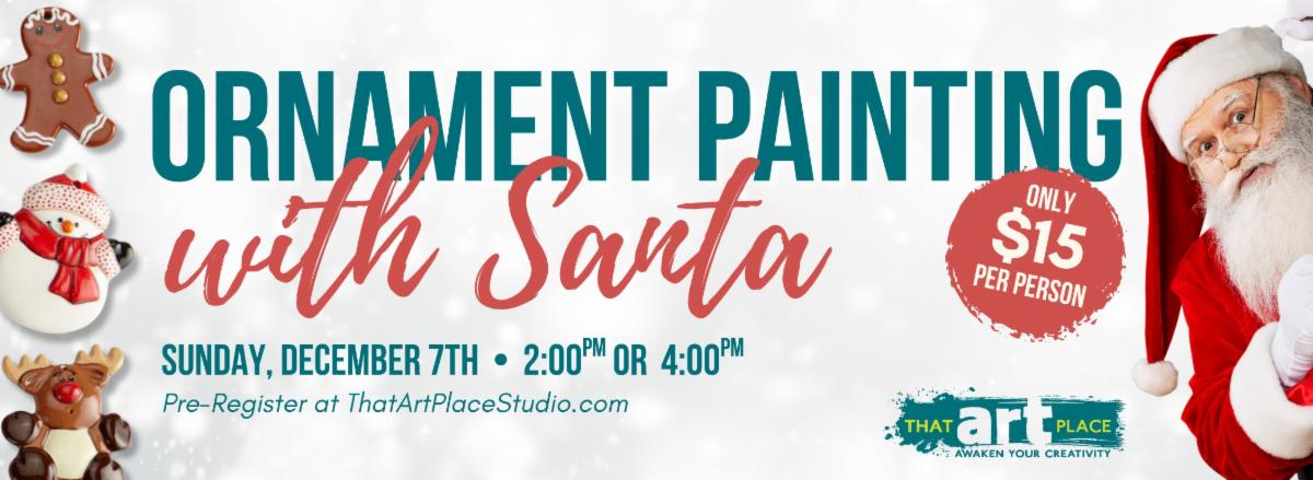 Paint with Santa! Join us for a magical afternoon of creativity and holiday cheer. Each $15 ticket includes one ceramic ornament with non-fired glaze, a photo with Santa (bring your camera!), and a festive cookie. Each person attending must have their own ticket. Choose from two sessions—2–3 PM or 4–5 PM—and take your ornament home the same day! Make art easy and memories merry at That Art Place in Belton. Pre-registration required.