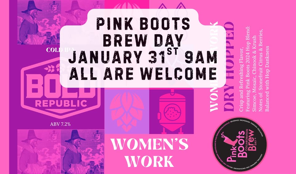 Join us Friday, January 31st at 9 AM for a special Pink Boots Collaboration Brew Day at Bold Republic Brewing! No brewing experience required—this is a hands-on, welcoming opportunity to learn, participate, and celebrate the women shaping the beer industry. We’ll be brewing “Women’s Work,” a Cold IPA, alongside the Pink Boots community. Whether you’re curious about the brewing process or just want to be part of something meaningful, this brew day is open to all who want to support, learn, and collaborate.