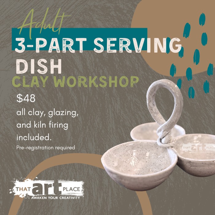 In this clay workshop, our instructor will guide students through the process of forming 3 bowls. The bowls will be joined together to create a fun and functional serving dish complete with a loop handle! Each project can be customized with texture, stamps, and clay sculpting tools. No clay experience necessary. This project does not use the pottery wheels. After the workshop, your serving dish will remain at the studio for 3 weeks to be bisque-fired, glazed with your choice of glaze. Ready in about 3 wks.