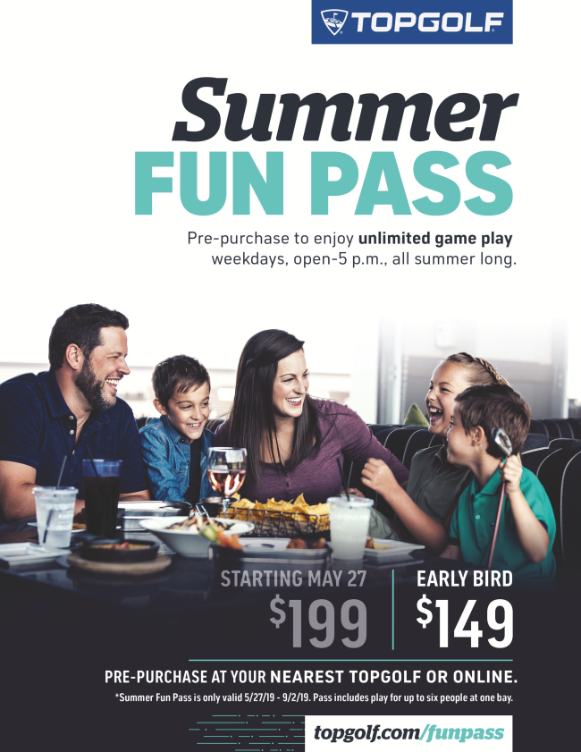 Buy a Summer Fun Pass and enjoy unlimited Topgolf game play for you and up to 5 guests per visit - weekdays until 5 p.m. - from Memorial Day to Labor Day. We’ll also send you Pass Perks which means you'll receive exclusive deals on food, events, retail and more throughout the summer!