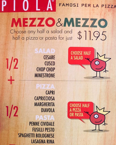 Piola Dora has a Mezzo & Mezzo special! Order half salad and get half Pizza and Pasta with it to enjoy for just $11.95
