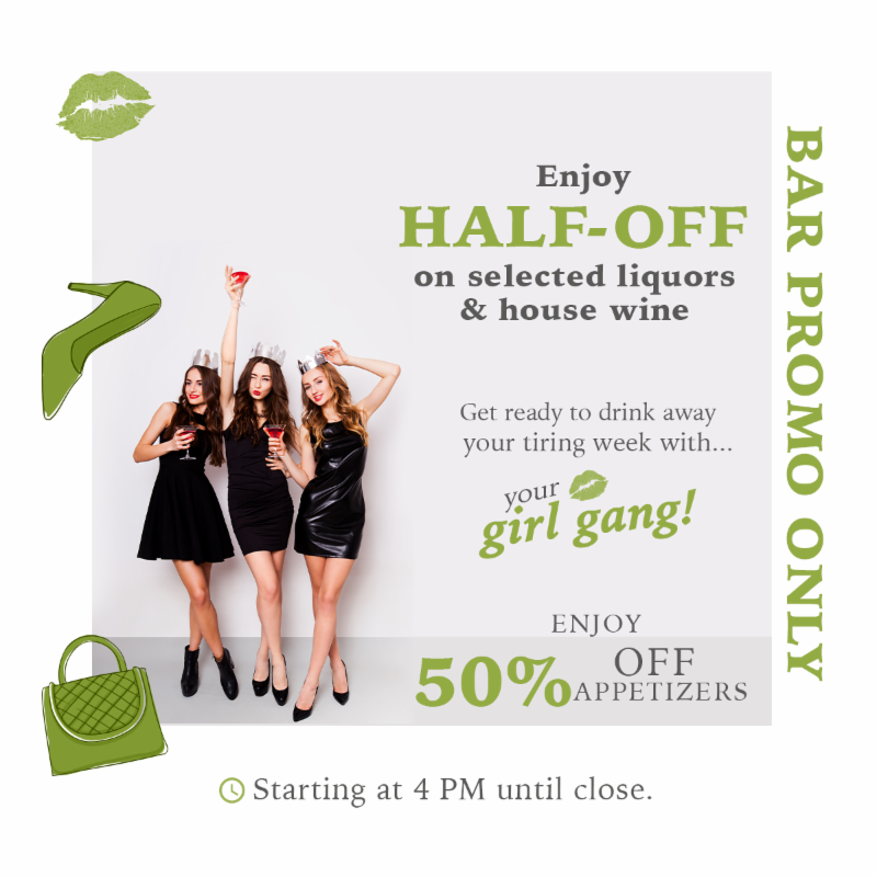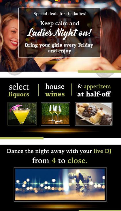 Fridays belong to the ladies at 107 Steak & Bar. Join us for half off select liquors, house wines, and appetizers from 4pm until close. Enjoy enticing drinks, delicious food, great ambiance, and live music. Plan this Friday evening with your girls to get the weekend started right! Valid only at the bar.