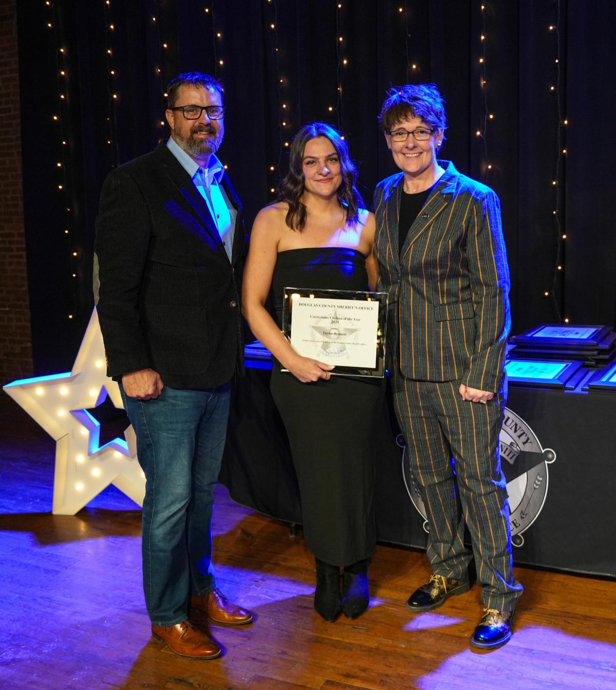 | Taylor Bennett, center, is the recipient of the Civilian Employee of the Year in Corrections. Taylor is an administrative specialist for the Sheriff's Office. She is pictured with Sheriff Jay Armbrister, left, and Undersheriff Stacy Simmons. | | Deputy Chris Chavez, center, is the recipient of the Sheriff's Office Excellence Award. He is pictured with Sheriff Jay Armbrister, left, and Undersheriff Stacy Simmons. | | Douglas County Emergency Communications Director Tony Foster, left, and Deputy Emergency Communications Director Sonya Baeza, right, are pictured with the recipients of the Unit Citation Award for their work dispatching the response to the March 14, 2025, grass fires in the county. From left are Michael Haefner, Kaitlin Schulz and Jacob Russell. Not pictured is Betsy Anderson, Kathleen Haehl, Jeremy Kohler and Tim Reisbig. | Emergency Communications (911) recognize staff | | |