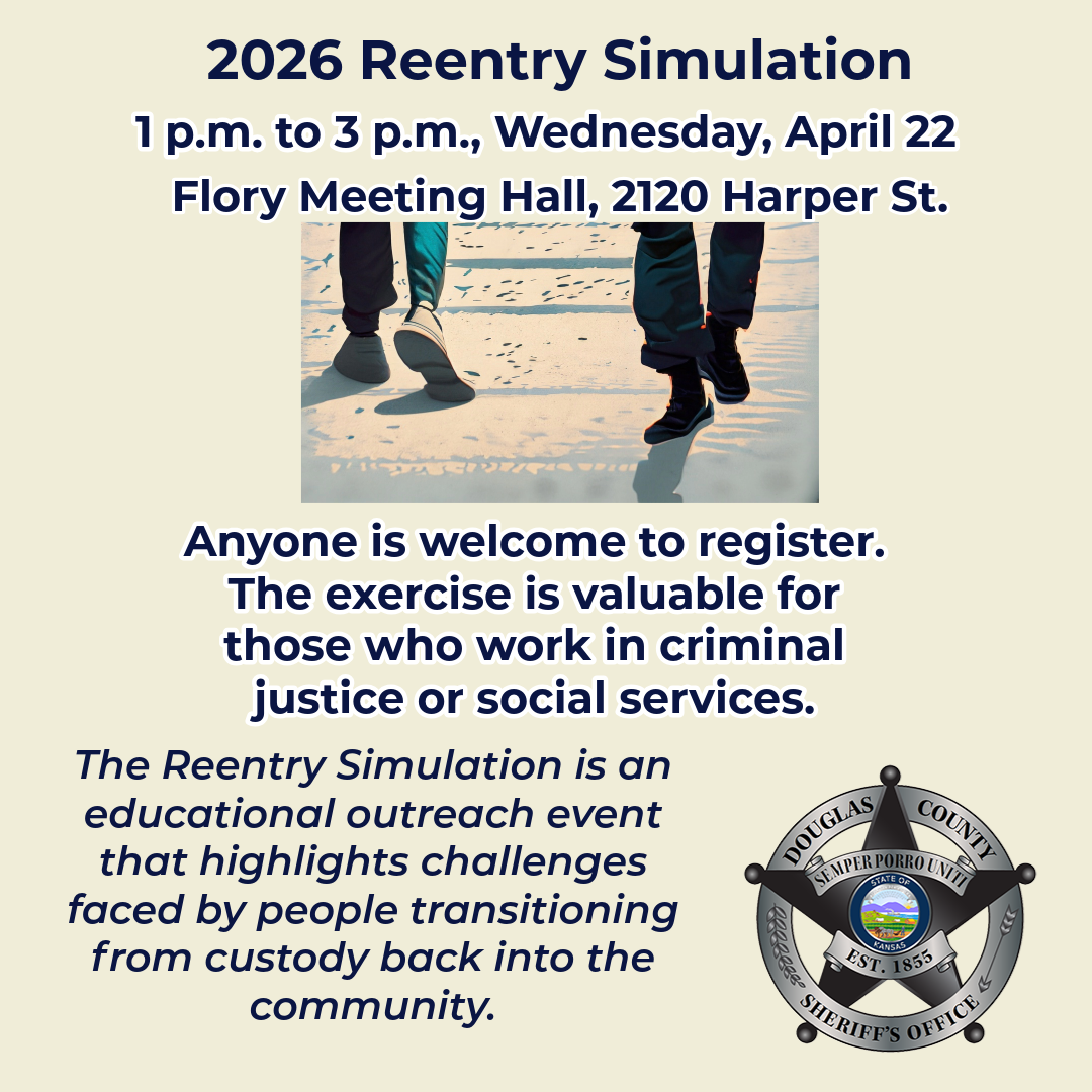 The Sheriff's Office Reentry Team is hosting a 2026 Reentry Simulation from 1 p.m. to 3 p.m., Wednesday, April 22, in Flory Meeting Hall at the Douglas County Fairgrounds, 2120 Harper St.