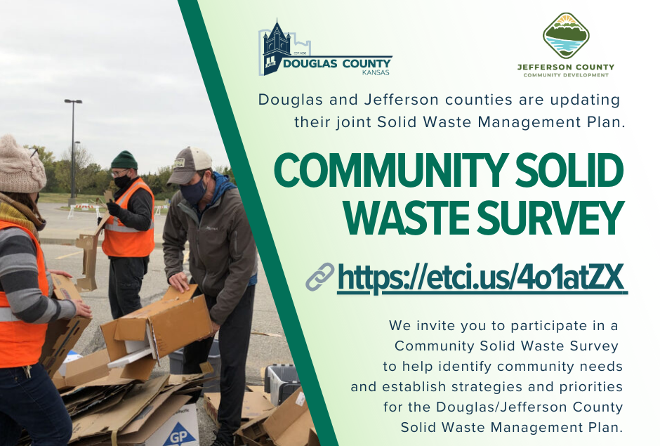 Douglas County invites residents of Baldwin City, Eudora, Lecompton and rural areas to participate in a Community Solid Waste Survey to help identify community needs and set priorities for the plan. The City of Lawrence will conduct a separate survey in early 2026, and those results will be incorporated into the joint plan.
