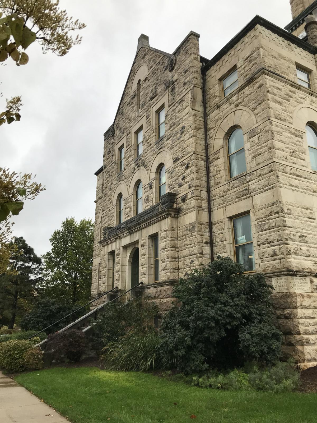 | A photo of the north side of the historic courthouse before restoration work started. | A photo of the stairs on the north side of the historic courthouse before restoration work. They were in a state of great deterioration, and bushes were planted in front of them. | | A photo of the north side of the building and the newly restored stairs. While the entrance will not be reopened, the stairs will now offer public access for uses such as seating and photography. | | Board of County Commissioners | | |