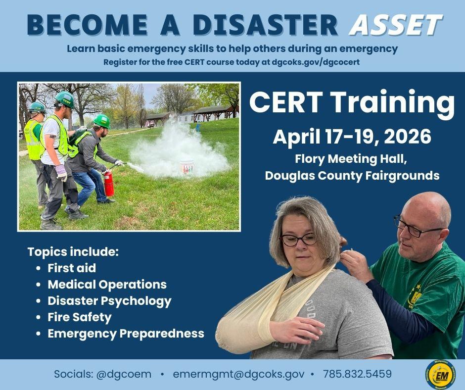 Douglas County Emergency Management is accepting registrations for its spring 2026 CERT (Community Emergency Response Team) weekend class. The course is designed to teach individuals to be better prepared to help themselves, their families and communities before, during and after a disaster.