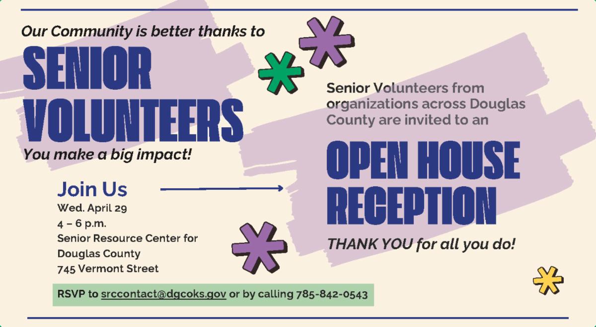 The Senior Resource Center (SRC) will host its annual Senior Volunteer Appreciation Reception from 4 p.m. to 6 p.m. Wednesday, April 29, at 745 Vermont St. The open-house-style event welcomes all senior volunteers in the community. RSVPs are requested by April 27 at srccontact@dgcoks.gov or 785-842-0543.